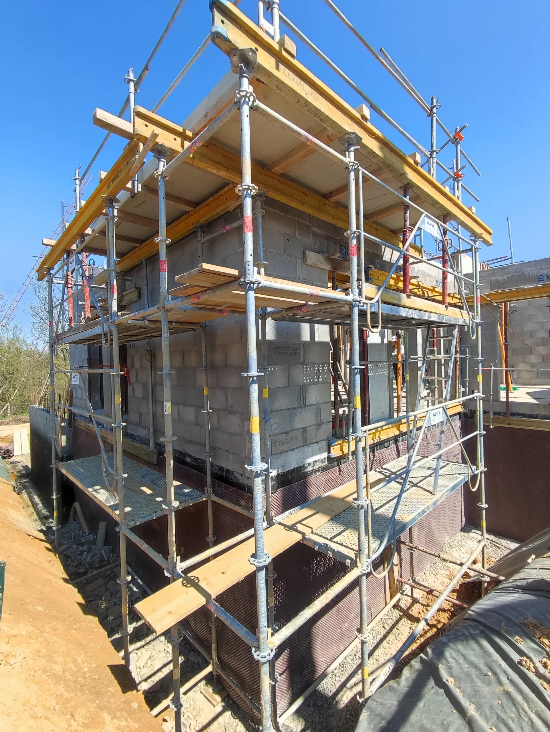 Réalisation du gros œuvre d’une villa d’architecte de 250 m², comprenant la mise en œuvre de voiles béton et de murs maçonnés, ainsi que la réalisation des planchers en prédalles. Le projet inclut également des colombages en surépaisseur au mortier ciment, demandant une exécution précise pour garantir l’alignement, la régularité des reliefs et la qualité des finitions.